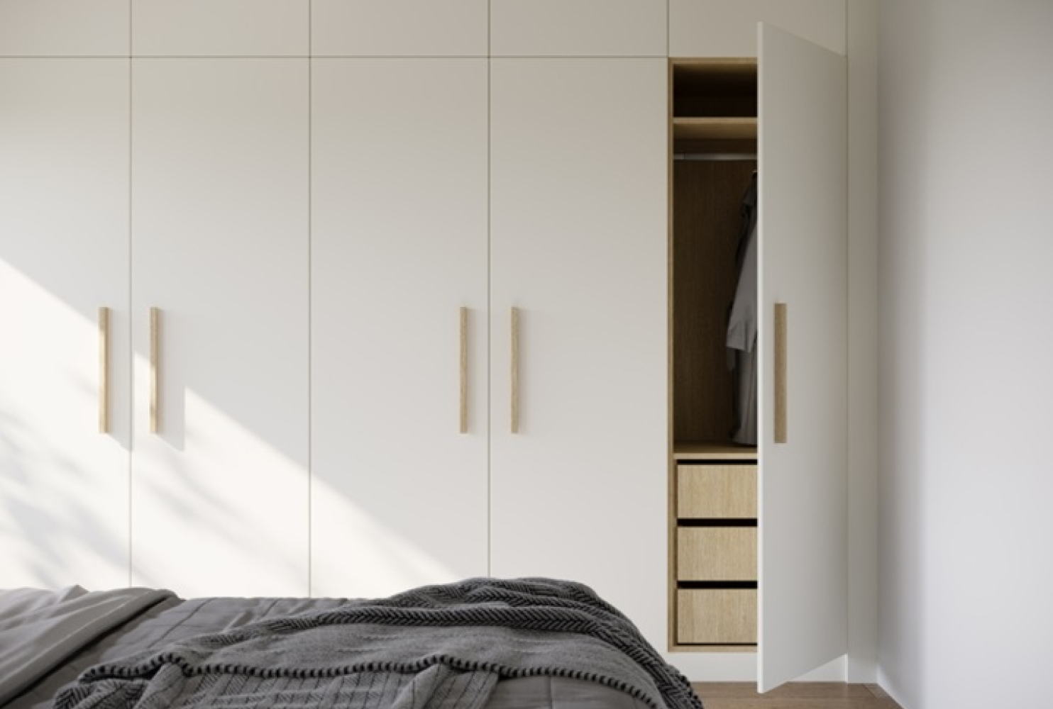 Встроенные шкафы со скрытыми дверями — популярный сегодня элемент минималистического дизайна. Они практически сливаются со стеной и не выделяются яркими деталями. Такие шкафы выглядят современно и оставляют много свободного пространства в комнате.